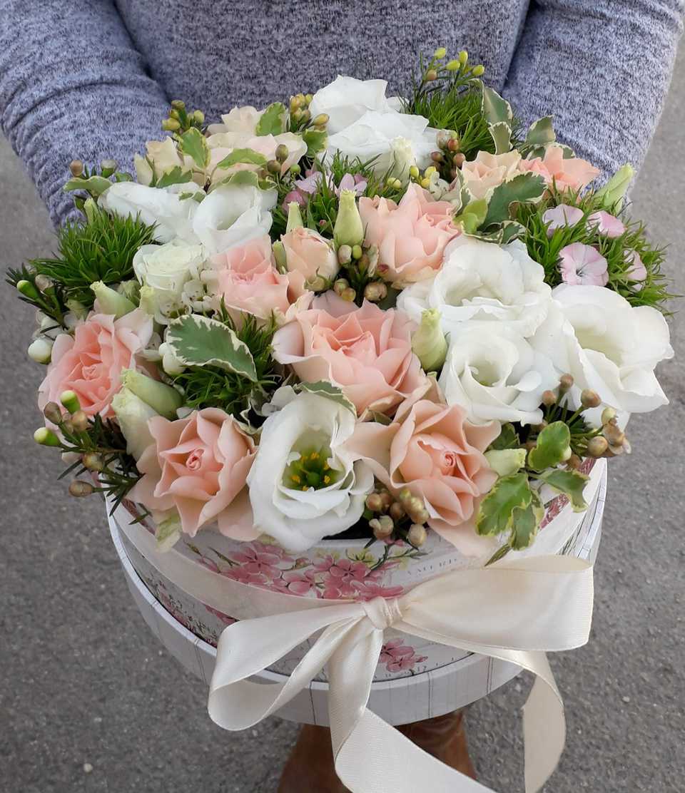 Elsősorban virágdobozainkat vegyesvirágokból készítjük. Ami szép és szezonális. Törekszünk a különleges színek használatára. A virágokon kívül egyéb zöld kiegészítőket is szívesen használunk. A doboz kartonból készült. Átmérője 24 cm. Körbe, szalaggal díszítjük még.