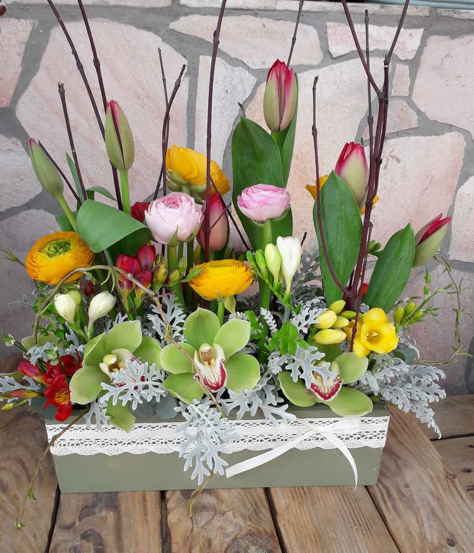 Ez a ládika tavasszal készült. Sajnos nincs egész évben tulipán, frésia, boglárka, de helyettesíthető rózsával, lisiantusszal......