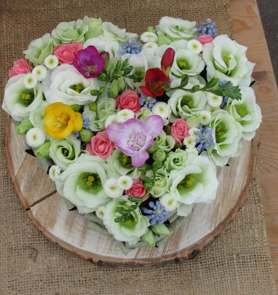 25 cm-es szív tűzőhabot virágoztunk be szebbnél szebb virágokkal. Lisiantusszal, csoportos rózsával, santinival, fresiával, gyöngyikével.