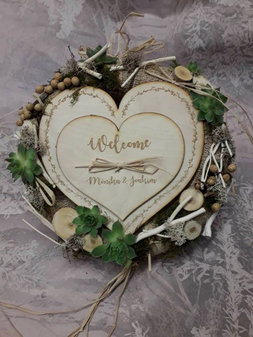 A koszorú közepére helyeztük a dupla, gravírozott szívet. A szöveget - neveket kívánság szerint gravíroztattuk.
