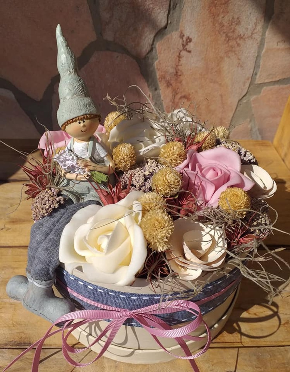 Habrózsadoboz, lógólábú manóval Jelenleg nincs raktáron! Mennyiség: Kosárba Kicsike kartondobozba 4 fej habrózsa, sok - sok natúr kiegészítő és egy lógólábú manó. Tartós virágdoboz. Ápolást nem igényel!!!Cikkszám: 3902