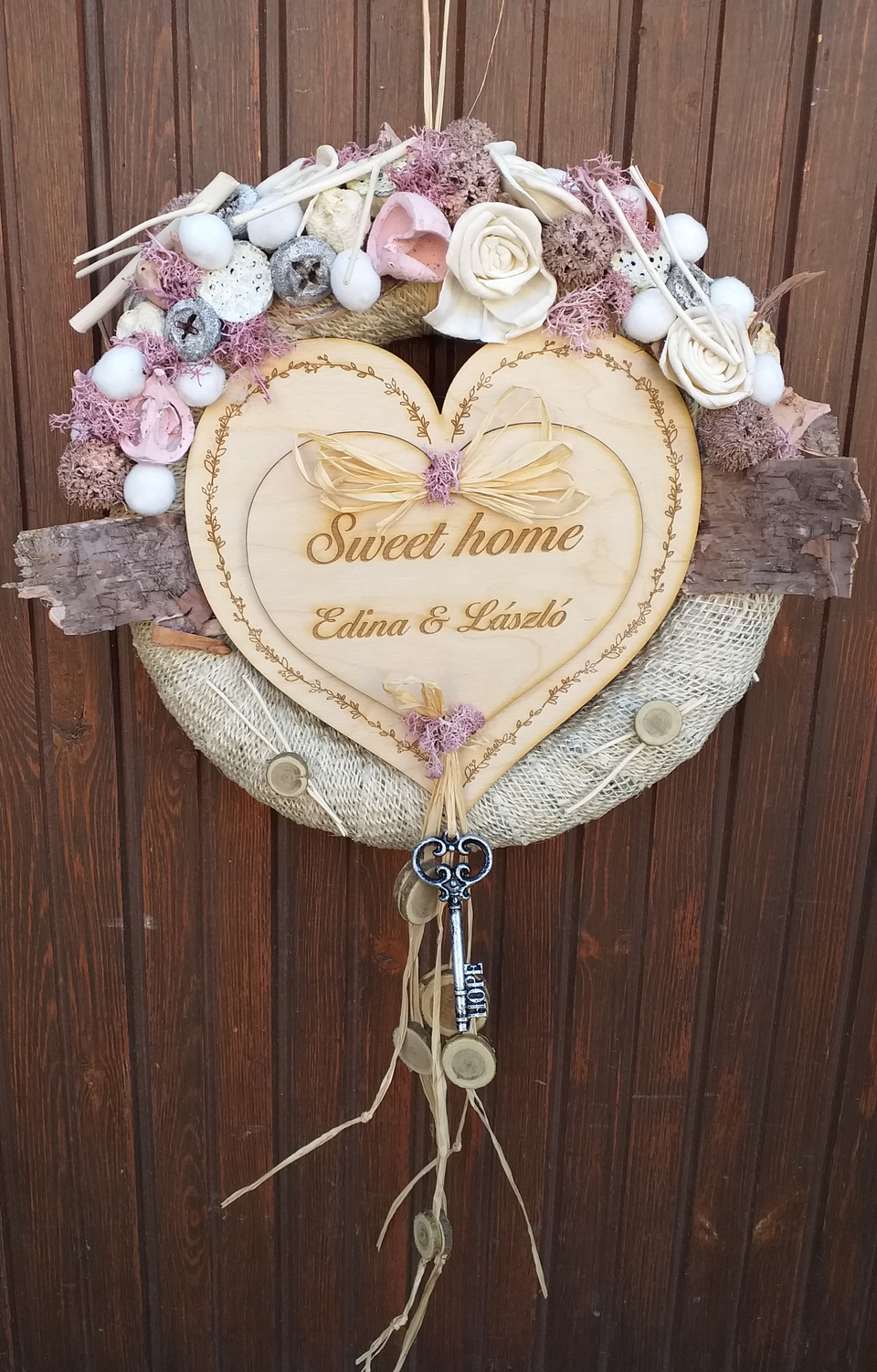 A koszorú közepére helyeztük a dupla, gravírozott szívet. A szöveget - neveket kívánság szerint gravíroztattuk.