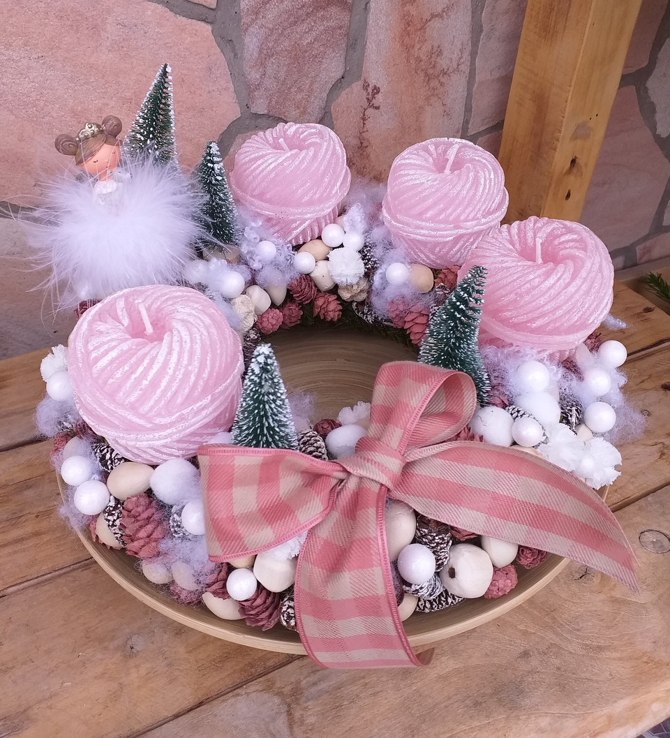 Gombolyag gyertyával és figurával díszített adventi koszorú